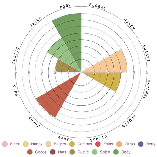 Sweetness rides the line between dark sugar syrup, and malted caramel, with accents of pungent spices, foresty hints, umami accents and medium body that thickens as it cools.